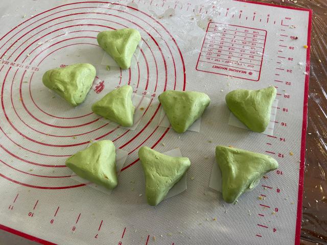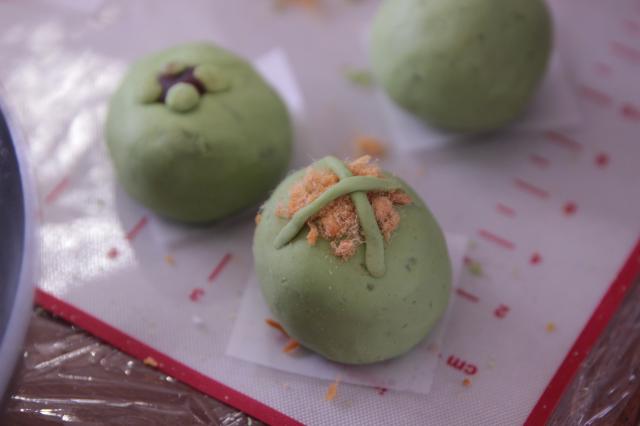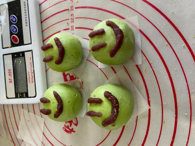 青色的麦草汁与糯米粉结合,做出清新软糯的青团皮,肉松咸蛋黄沙拉酱不停搅拌,形成咸香又富有层次的馅料。称重、搅拌、包馅、塑形,老师们一步步认真地学习和执行菜谱上的步骤,做出了一个个或浑圆或别具风格的青团们。