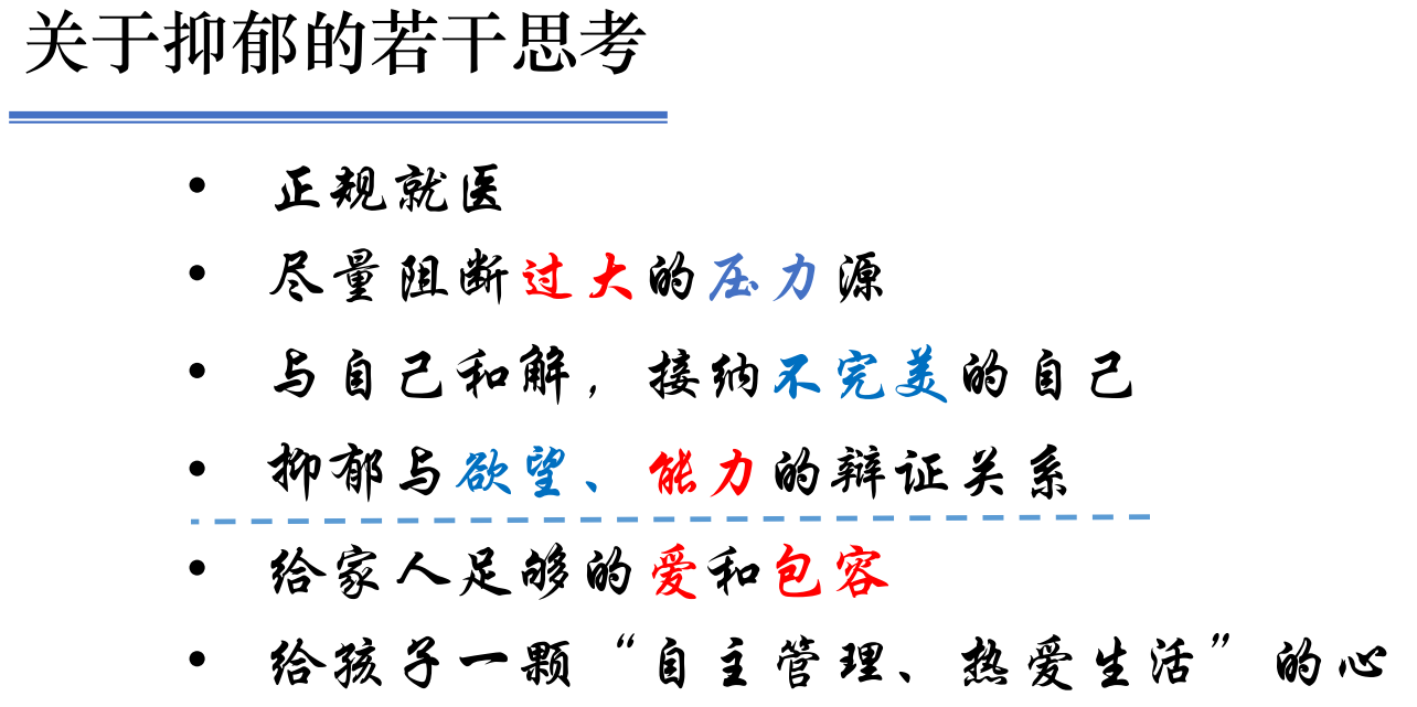 最后,李老师建议大家给家人足够的爱与包容,并坚持终身学习,通过“戒贪,戒嗔,戒痴,戒慢,戒疑”抵御抑郁“五毒”侵扰。通过宣泄,与朋友交流,写日记,多读书,生存体验等多种方式与自己和解,学会接纳不完美的自己,是我们一生的必修课。
