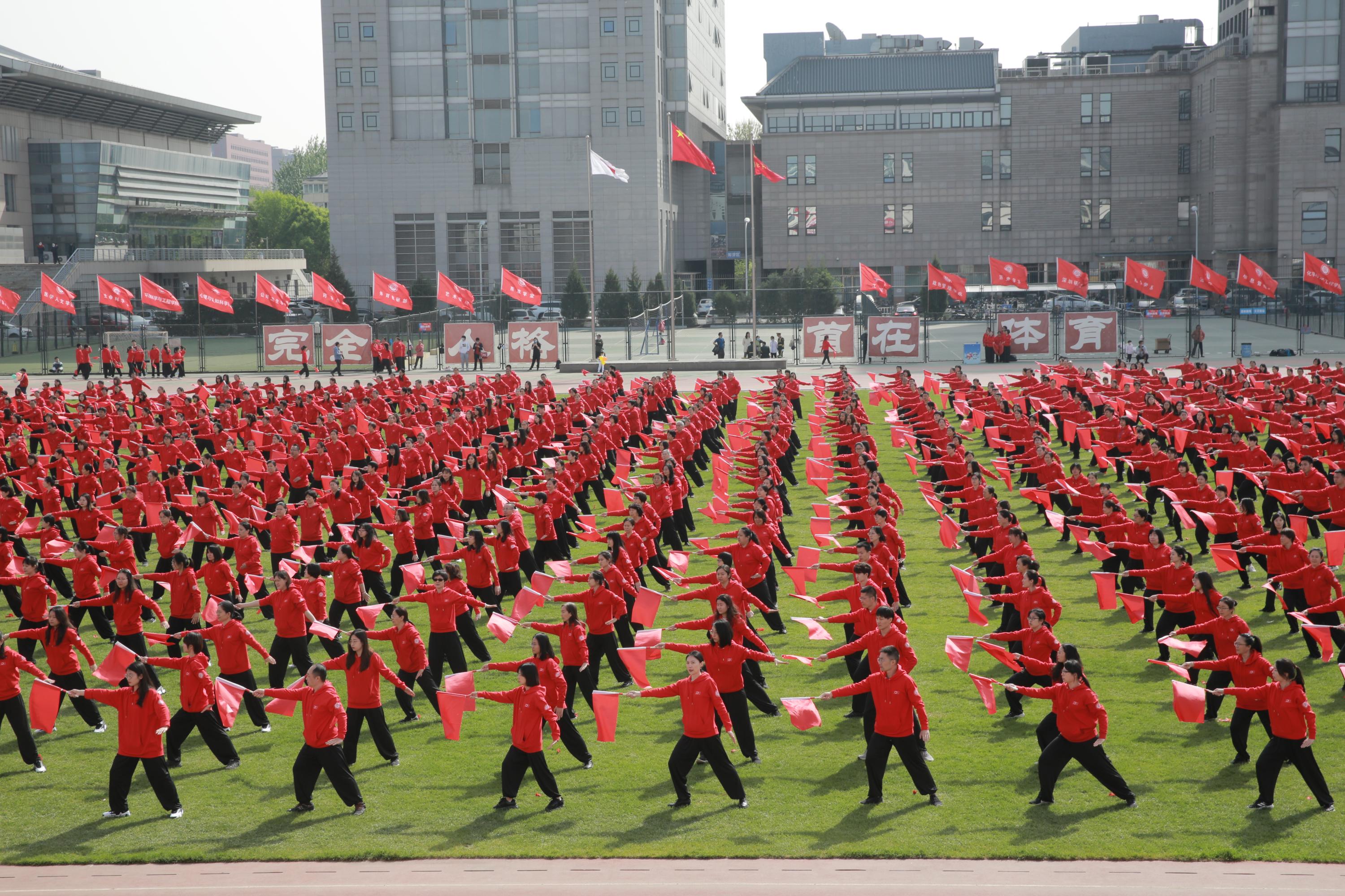 开幕式上,图书馆教职工们在《红旗颂》的激昂旋律下,手持红旗,展现了太极拳的刚柔并济。演出结尾,参演的教职工们组成心连心图案,国旗、校旗缓缓展开,北大心,中国心,心心相印,心心相连,“团结起来,振兴中华,一起向未来”!