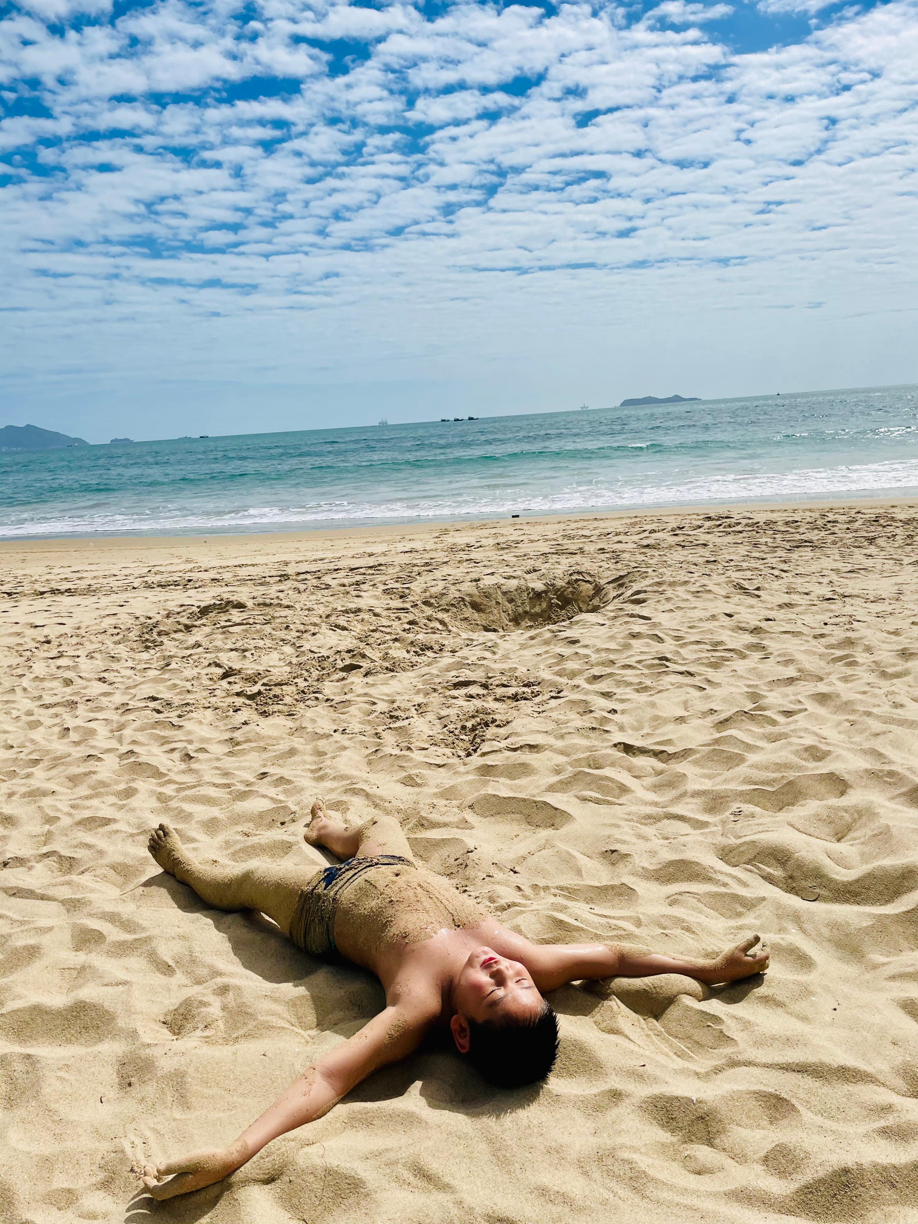 几年未远行。大年初一的早晨见到大海的孩子犹如离弦之箭冲到温暖的沙滩上与大自然融为一体。
