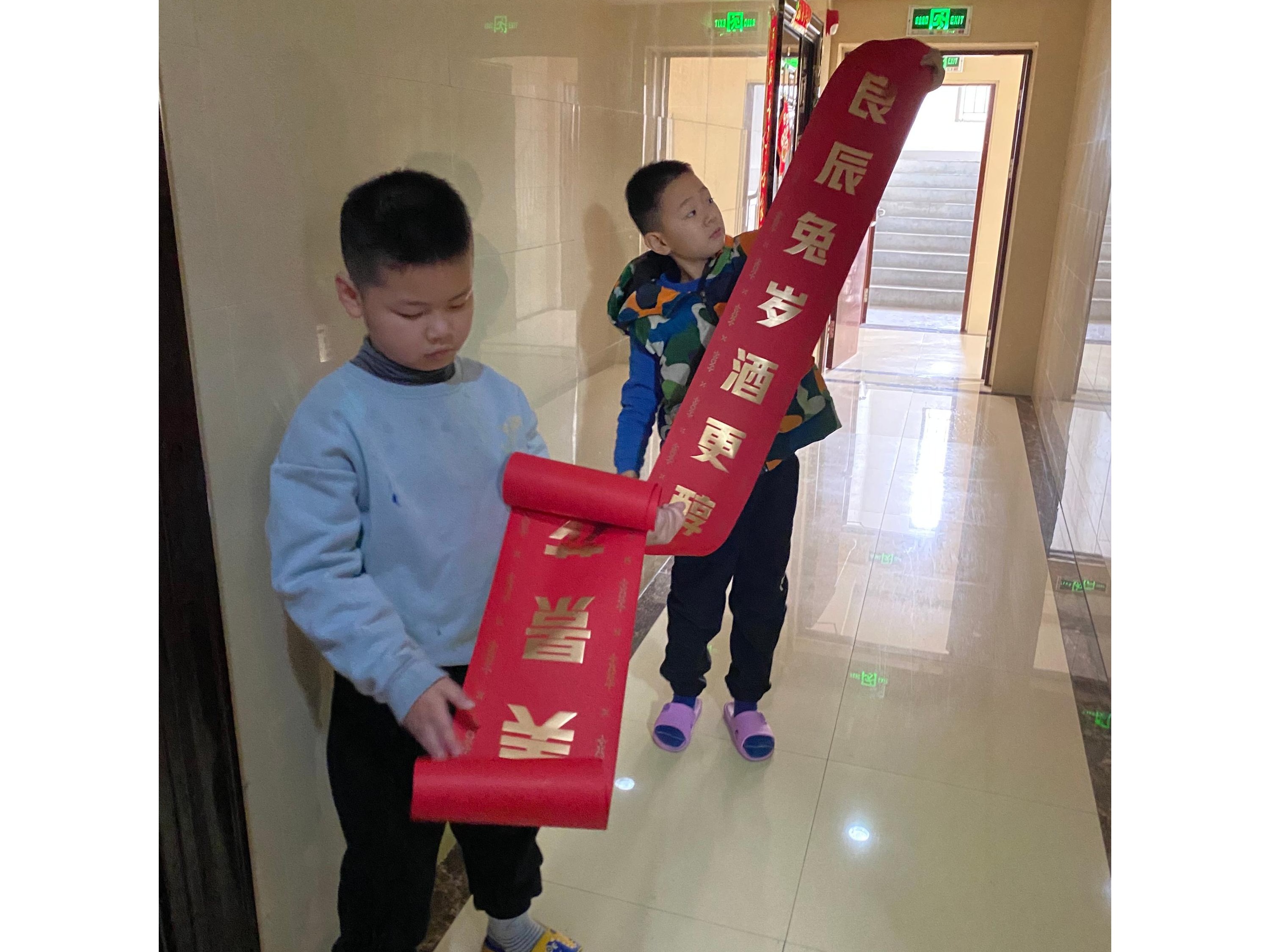孩子第一次自己贴春联的茫然与无措。