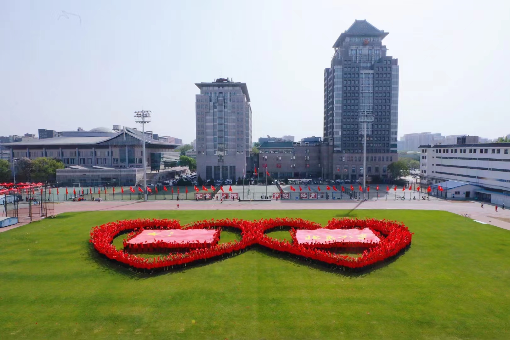 校医院40人的队伍参与了开幕式大型团体操表演《同心追梦》,集合了舞龙、太鼓和太极拳,蕴含着中国传统文化的精神内涵。与北大师生一起,在绿色的运动场上组成两个巨大的爱心,北大心、中国心,心心相连。