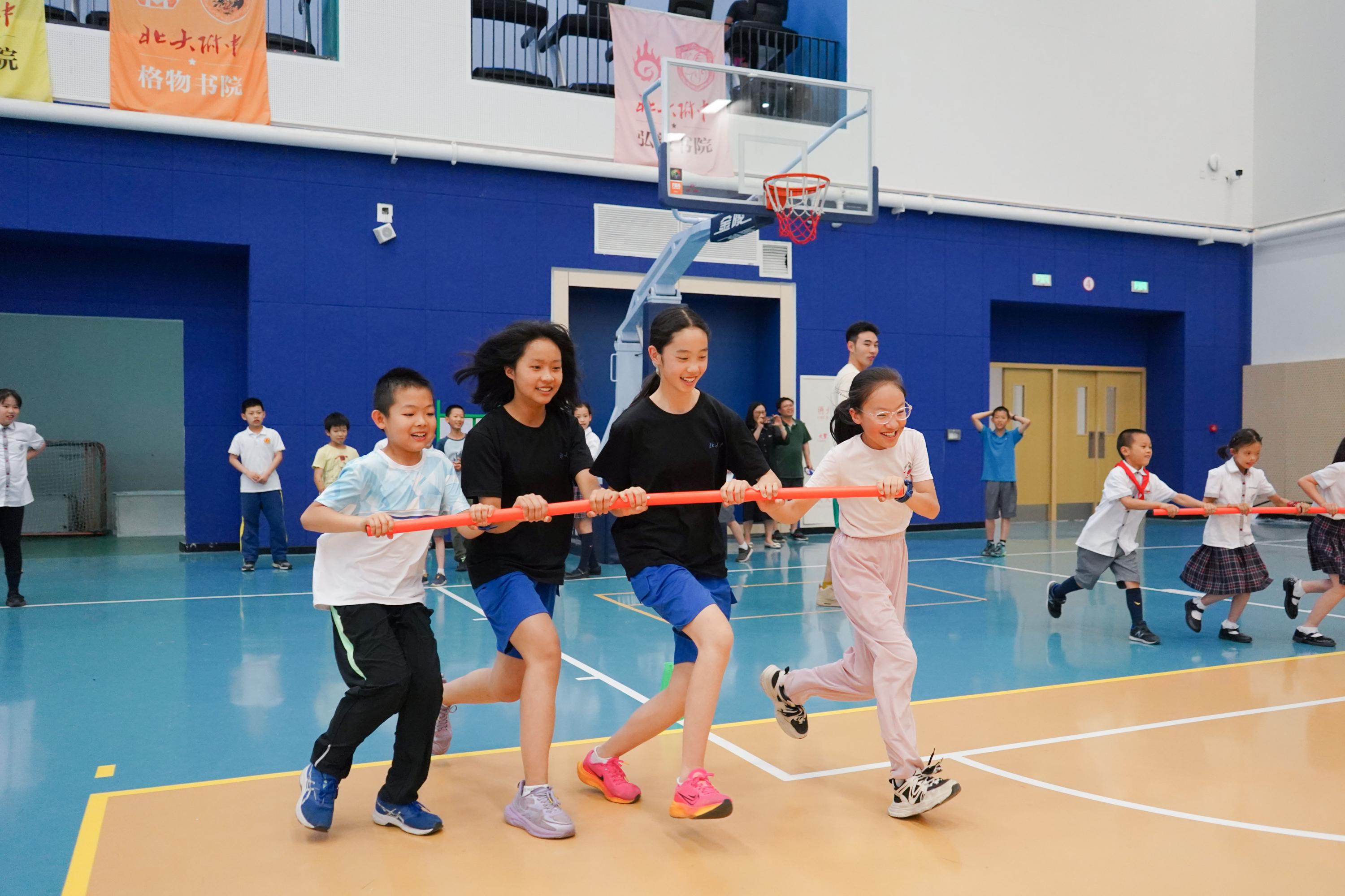 做完风筝,孩子们来到附中欣建体育馆综合馆,12岁以下的小朋友选择了不同的趣味项目,袋鼠跳、手脚并用、小兔子过河(亲子)、套圈、团结一心(亲子)、丢沙包、车轮滚滚、穿针引线(亲子),孩子们在附中体育老师的组织下,开心的参加各种活动,体育馆内充满了欢乐的笑声。