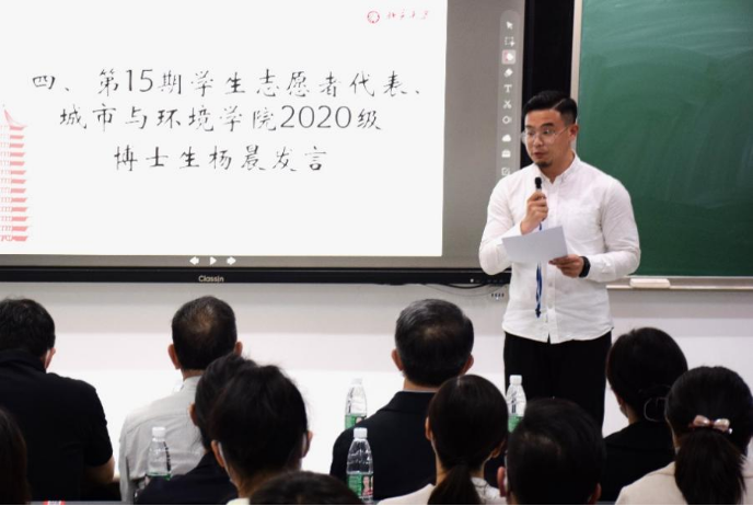 第15期学生志愿者代表、城市与环境学院2020级博士生杨晨对广大学员为北大校园所做的奉献表达了感谢。他表示,平民学校的学生志愿者将尽其所能,提供服务,保障课程质量,为各位学员终身学习、追求上进的梦想助推加力。