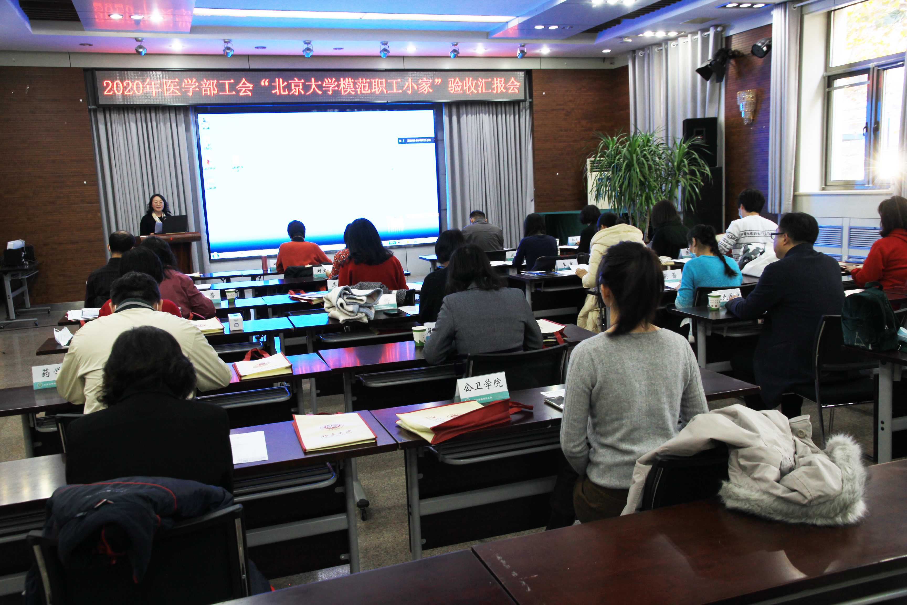 11月19日下午,北京大学医学部工会系统2020年“北京大学模范职工小家”验收汇报会在医学部工会活动厅召开。医学部工会常务主席刘穗燕、副主席董惠华、各院级工会常务副主席、副主席、以及申报“北京大学模范职工小家”的工会组长20余人参加现场会议,近60位专兼职工会干部通过线上会议观摩学习。