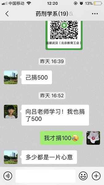 药学院工会:2月2日,响应医学部工会号召,药学院工会向工会干部转发了“北京市温暖基金‘温暖武汉’项目方案”,号召全体工会干部,引导、动员全院教职工为武汉灾区人民伸出援助之手,捐献资金、口罩和消毒液等防疫物资。各工会小组积极行动起来,迅速将这一倡议在各系室工作群中转发,将北京市温暖基金会为“温暖武汉”项目向社会公开筹款的信息通知到所有教职工。教职工们收到捐款信息后,以“一方有难,八方支援”的精神,纷纷积极参与这一奉献爱心行动。从2月2日开始,从几十元到几百元一笔笔款项带着药学院教职工的浓情厚谊源源不断地汇聚到了温暖基金会的账户里,截至目前,药学院职工自愿捐助款项已达15000余元,且温暖仍在不断传递。