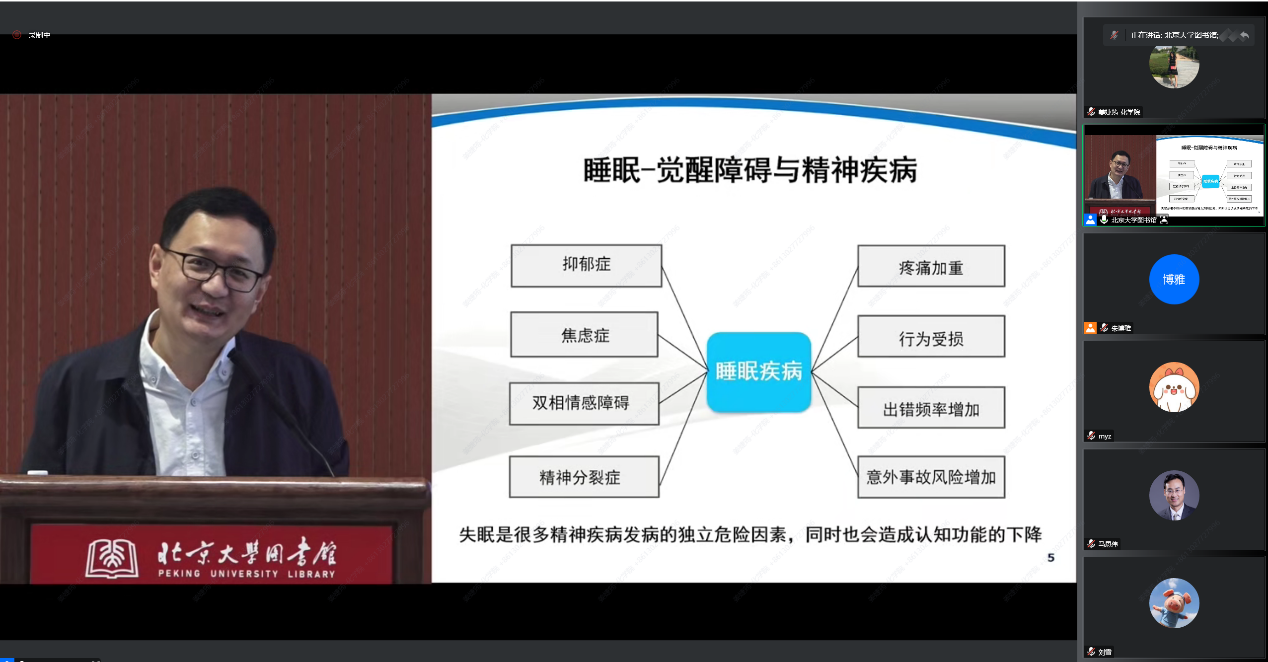 范老师以睡眠与健康的关系展开讲座。据报告,约有38.2%的人存在失眠等睡眠问题,而睡眠-觉醒障碍与身体、心理等各方面疾病都相互影响。睡眠对于人体消除疲劳、提高记忆力和抵抗力、促进生长发育、预防皮肤衰老等起到重要作用。