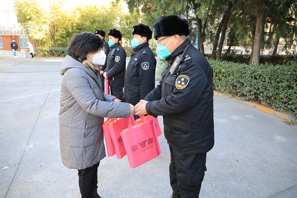 医学部党委副书记、工会主席朱树梅代表医学部党委和工会向校园一线的保安队员表示慰问,并对大家的坚守工作岗位表示肯定。疫情当前,安保队员在安保工作一线上非常辛苦,无论严寒酷暑、节假日还是在疫情期间大家坚守岗位,不辞辛苦服务学生、教职工,为学校的安全稳定和抗击疫情做出了积极贡献。希望大家在做好日常安保工作的同时,注意个人疫情防护,注意保暖,劳逸结合,保重身体。随后,医学部工会为队员们赠送了慰问品。