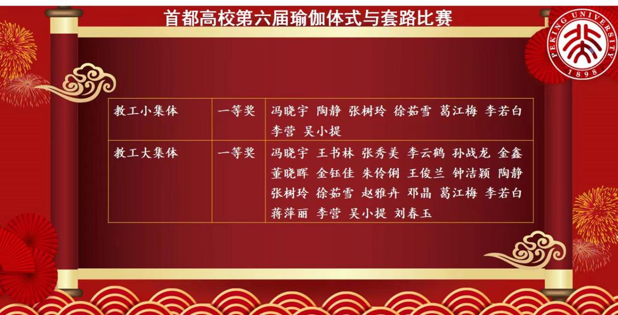 北京大学瑜伽代表队指导教师为体育教研部副教授亓昕,医学人文学院体育与健康系讲师万梨,教工队22人,学生队30人,经过一天的激烈比赛角逐,师生们团结一心、挥汗赛场,最终荣获教职工大集体比赛和小集体比赛双项冠军,学生甲组大集体一等奖、男单一等奖、女单一等奖(2人次)、混双二等奖、小集体三等奖,甲组团体总分第一名,并再次荣获最佳组织奖,亓昕获“优秀裁判员”,万梨获“优秀教练员”。