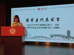 马来西亚留学生代表白湘怡则在致辞中简单介绍汉字书法文化在马来西亚青少年界的发展和马来西亚书艺总会青年团的成立背景及现状。她表示,十分荣幸能够担任学生书画协会外务部部长一职,希望此新部门能够扩大在国内外高校社团乃至国际相关组织间的影响力,展现北大青年积极的精神面貌和“兼容并包”的优良学风。