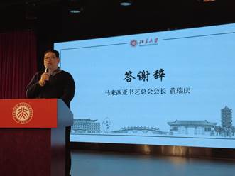 黄瑞庆在致辞中答谢了北京大学的热情接待。他表示,马来西亚书艺总会秉承弘扬东南亚华文书法的使命,为东南亚书法家提供了一个交流、展览和互动的平台。马来西亚书法融合传统中华书法,吸收时代和地域文化,通过创新发展,成为独具特色的马来西亚华文书法。此次交流活动开启及建立了马来西亚书艺总会与北京大学的书法桥梁,为日后深度合作进行铺垫。