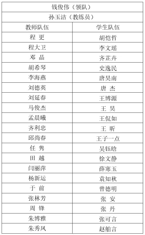 我校徒步运动代表队由体育教研部主任钱俊伟担任领队,孙玉洁任教练员,队伍由教师代表队和学生代表队组成。教师代表队汇集了来自各学院及职能部门的20名老师,而学生代表队则由北京大学徒步队的20名队员组成。