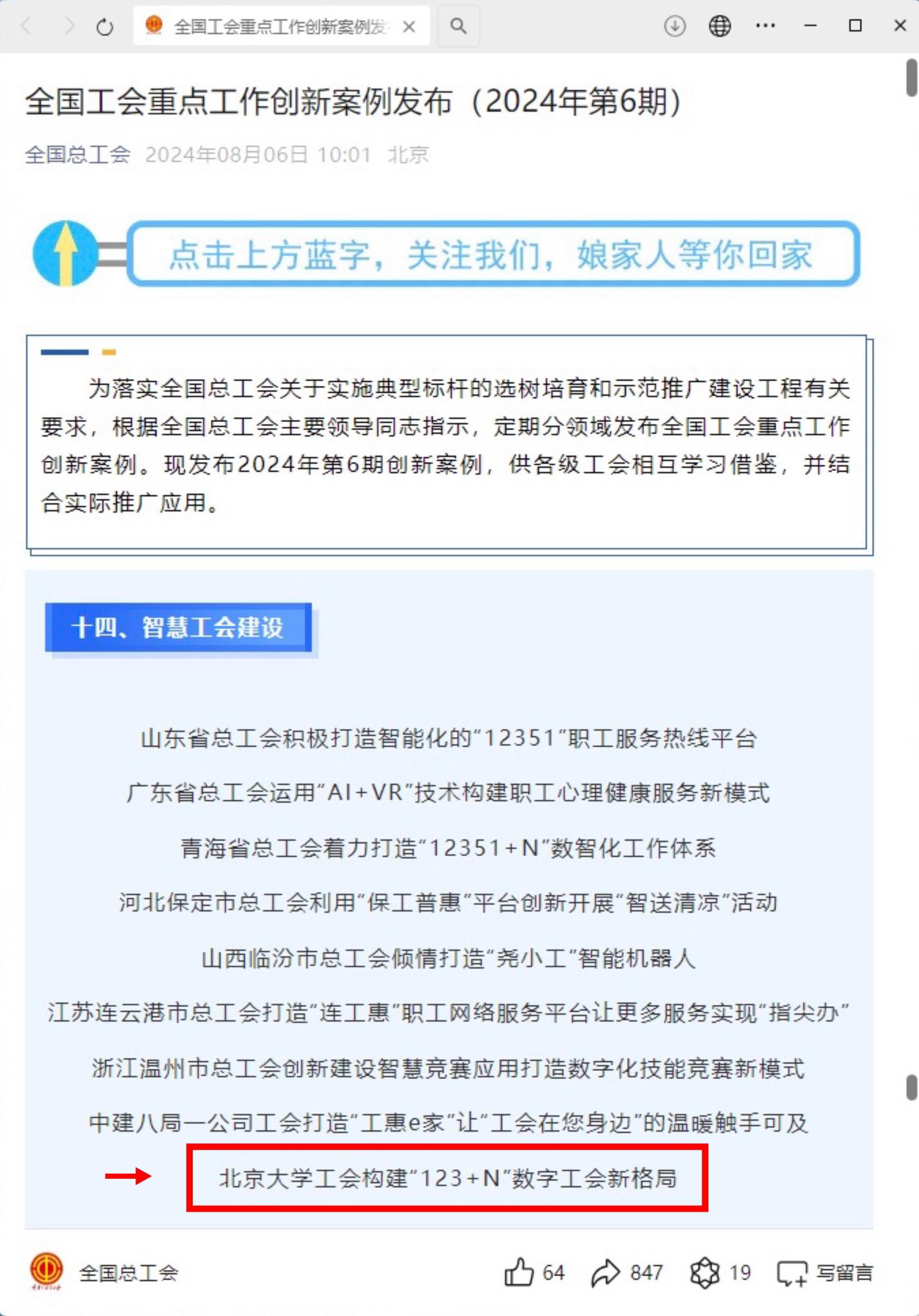 8月6日,全国总工会发布第6期创新案例,覆盖十六个方面的工作。『北京大学工会构建“123+N”数字工会新格局』入选智慧工会建设创新案例。