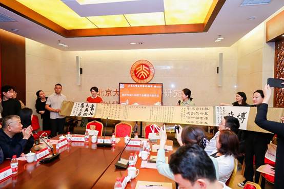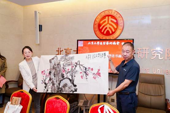 仪式上,燕园印社作为造型艺术协会的兄弟社团,集体为协会成立创作了绘画作品《松梅图》,由燕园印社秘书长张岩赠送,北京大学工会常务副主席张宝岭代表校工会受赠。造型艺术协会筹备组创作了书法作品长卷《博雅》,由协会副会长白锐赠送,张小萌代表校工会受赠。两件作品入藏校工会,进一步象征了造型艺术与北大校园文化的紧密融合。