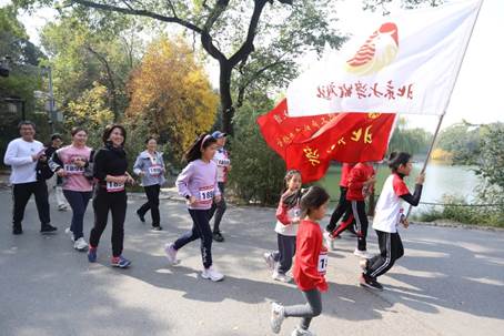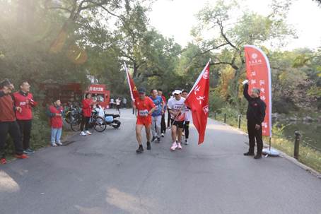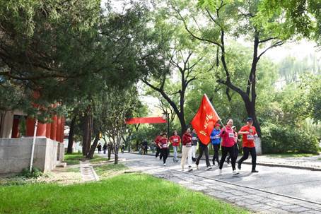 早上8:30,简短的起跑仪式在博雅塔下举行。伴随着雄壮激昂的《义勇军进行曲》,活动正式拉开序幕,安钰峰将北京大学校旗移交给第一棒队员后,接力跑正式开跑。“环湖接力跑,阔步新征程”,大家在校旗的引领下,一路跑过第一体育馆、体斋、红四楼、红三楼、花神庙,再回到博雅塔下。