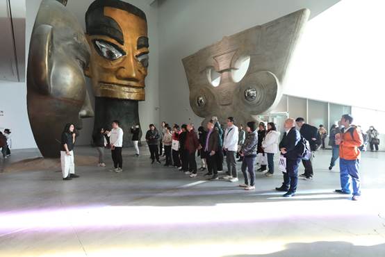 在志愿者充满激情与专业的讲解引领下,北大青年教师们漫步于各个展厅,悉心欣赏每一件文物,深刻感受中华传统文化的博大精深与无穷魅力。现场的多组大型艺术装置更是为此次观展增添了浓厚的艺术氛围,古朴的巨型复制面具、高耸的大柱、庄严的祭祀复原现场、瑰丽的光影空间以及令人叹为观止的AI青铜器画廊等,共同营造出极佳的沉浸式观展体验,使大家仿佛置身于历史的长河之中,与古老文明进行着一场跨越时空的对话。