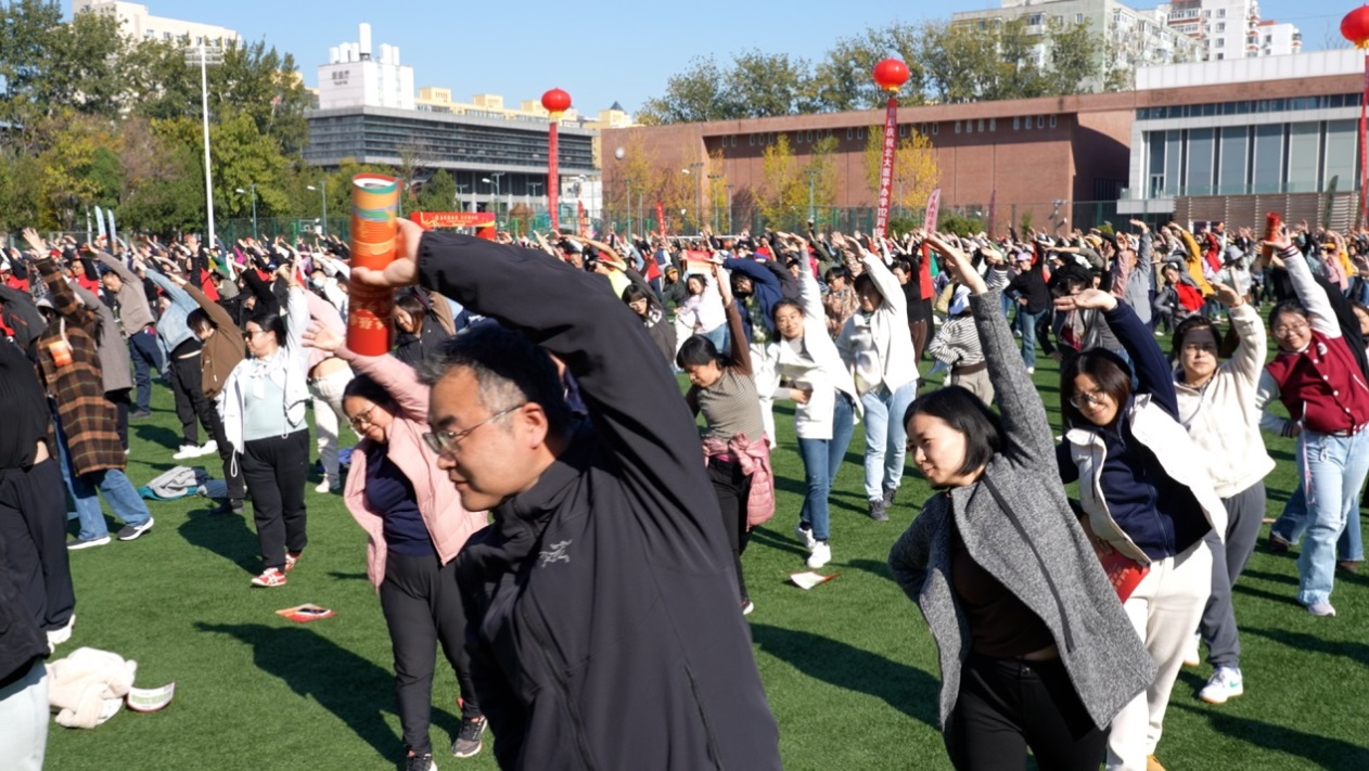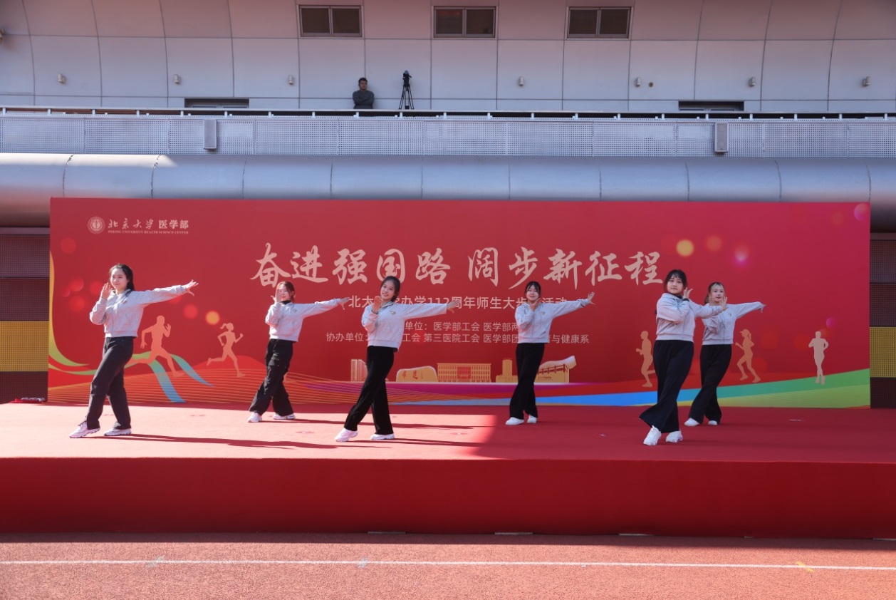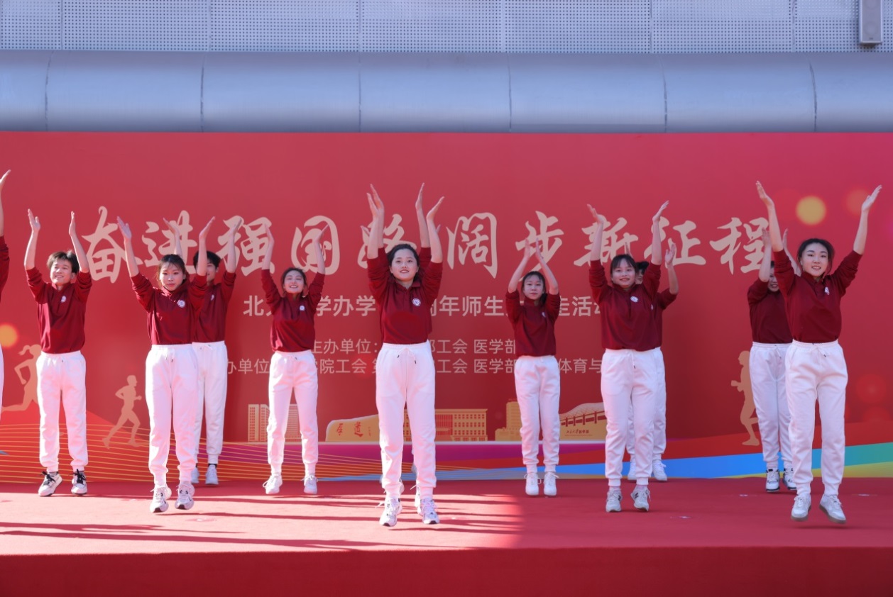 活动在精彩纷呈的暖场表演中拉开序幕。北医同学们带来的健身操表演《forever young》动感十足、学生霸云街舞社的街舞表演《wannabe》活力四射、医学部后勤幼儿园青年老师们表演的舞蹈《奔跑青春》活泼灵动,医学人文学院体育与健康系的老师们带来的热身活动点燃现场激情,把活动气氛推向高潮。