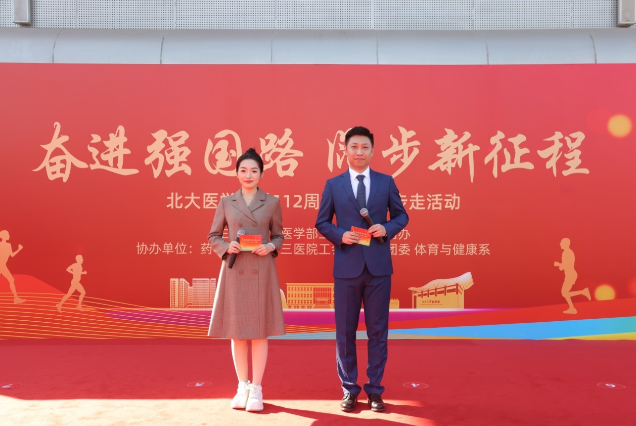 在北大医学办学112周年之际,北京大学医学部于10月28日下午举办“奋进强国路阔步新征程”——北大医学办学112周年师生大步走活动。北京大学常务副校长、医学部主任乔杰,北京大学原常务副校长、医学部原常务副主任、北医校友会会长柯杨,医学部副主任段丽萍、王维民、肖渊、刘晓光、王嘉东、孙智利,医学部党委副书记、工会主席朱树梅,北京大学纪委副书记、医学部党委副书记、纪委书记王军为,百洋医药集团董事长、88级北医优秀校友付钢共同为大步走活动鸣枪发令。1500余名师生及校友代表参加活动,向北大医学献上最诚挚的生日祝福,彰显了自信自强、守正创新的精神,以更加昂扬的姿态奋进强国路、阔步新征程。此次活动由北京大学第三医院教师武卫平、北京大学药学院2019级长学制学生吴泓仪主持。