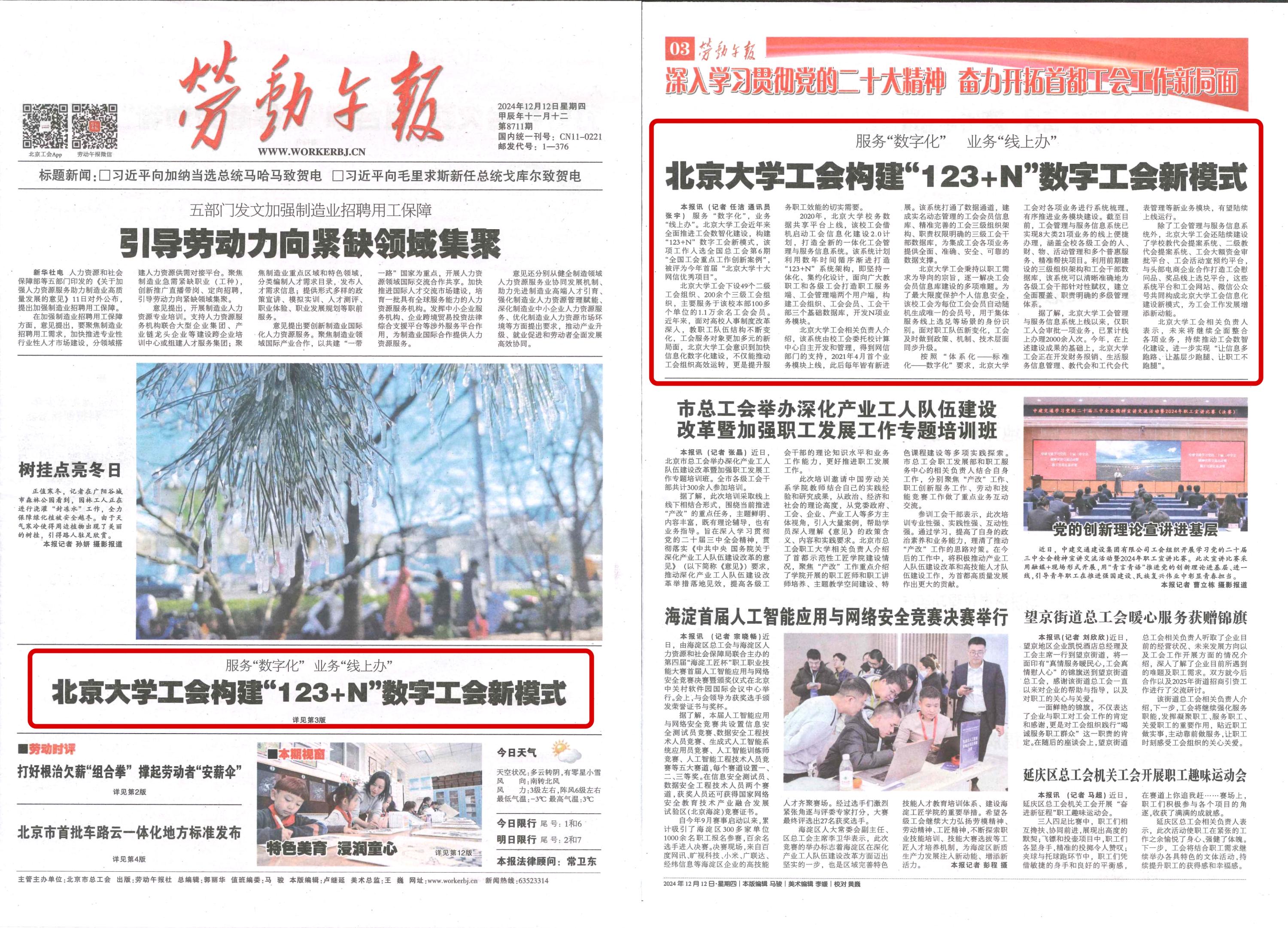 2024年12月12日,北京市总工会机关报《劳动午报》工会版头条刊发文章《北京大学工会构建“123+N”数字工会新模式》,对我校工会积极推进服务“数字化”、业务“线上办”相关工作进行了专题报道。