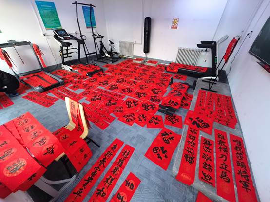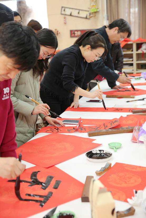 下午,燕园印社成员们奔赴圆明园校区。圆明园校区为丰富业余文化生化,专门开辟了书画室、活动室。虽天寒而情暖,现场气氛,热烈非常。老师们怀热忱之心,抒新春之愿。以笔寄情,用墨送福。“灵蛇出岫迎佳气,瑞霭盈庭报福音”,春联寓意,尽蕴吉祥。印社成员与北大圆明园校区的老师和工作人共浸墨香之境,同感传统文化之深邃。笑语欢声,和墨香而四溢;情浓意厚,伴年味以氤氲。不同字体、不同风格的书法作品相互交融,北大之精神:思想自由,兼容并包,于此次活动之中,尽显无遗。