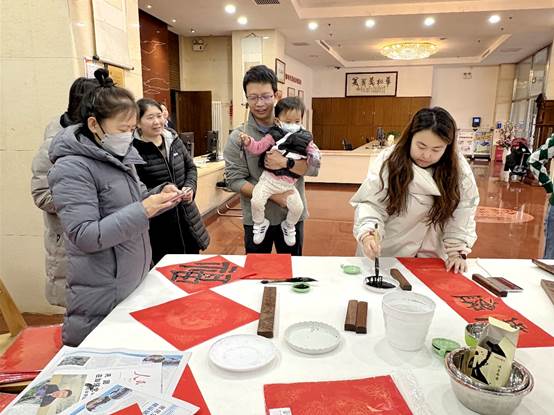 12月29日上午,公寓服务中心副主任王太芹老师带领团队早已在万柳四区前厅布置就绪,现场墨香氤氲,似雾霭之流芬;笔锋逸转,如灵蛇之舞袂。一幅幅饱含美好寓意的春联,“春到堂前添瑞气,辉盈庭内起祥云”,一笔一划,若春花绽于纸上,秀丽而典雅;“斗杓霞影知时序,柏叶椒花献岁新”,字里行间,似古韵流于毫端,苍劲而古朴。福字书写更是风格多样,有的笔画刚劲有力,宛如蛟龙腾空;有的则婉转柔美,恰似灵蛇蜿蜒。这些精美的作品吸引了众多师生,他们围在书桌旁,或挑选心仪之作,或静静欣赏书写过程,或拿起毛笔,书写新春的祝福。现场赞叹声不绝于耳,每个人脸上都洋溢着对新春的期待与喜悦。