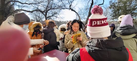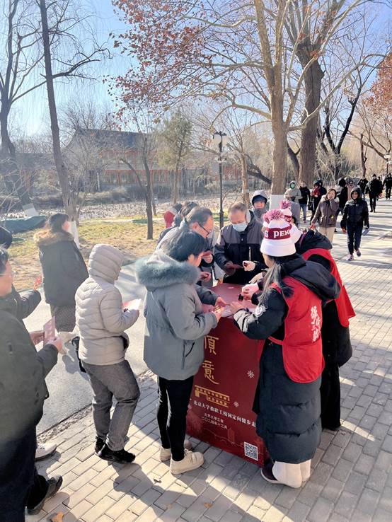 老师们在活动起点签到后,即可领取集福卡,先后在第一体育馆、朗润园的科维理所门前、鸣鹤园、国际关系学院楼东侧完成完成盖章打卡后,回到终点,完成最后一个盖章。四处打卡点均为精心设计,大家沿途走过北京大学文脉最为浓郁的燕南园,走过博雅塔下未名湖畔,朗润,镜春,鸣鹤等古园典雅庄重,校园新景雕塑《和平守望》传递出生生不息、奋发向上的精神。