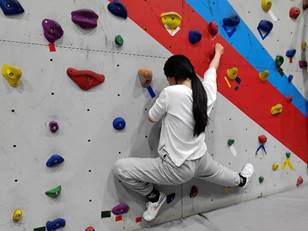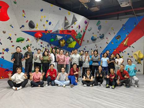 课程进入自由挂壁训练环节。规则很简单,老师们可以采用任何姿势,只要能在岩壁上坚持即可。老师们纷纷挑战自我:有人以"蜘蛛侠"式贴壁静默坚持,有人尝试攀爬来回寻找舒服的姿势,还有的创新出"太空步"趣味姿势。尽管汗水浸透衣衫,但笑声回荡在整个岩壁场馆。令人惊喜的是,大部分老师都展现出了顽强的毅力,成功坚持了3分钟。