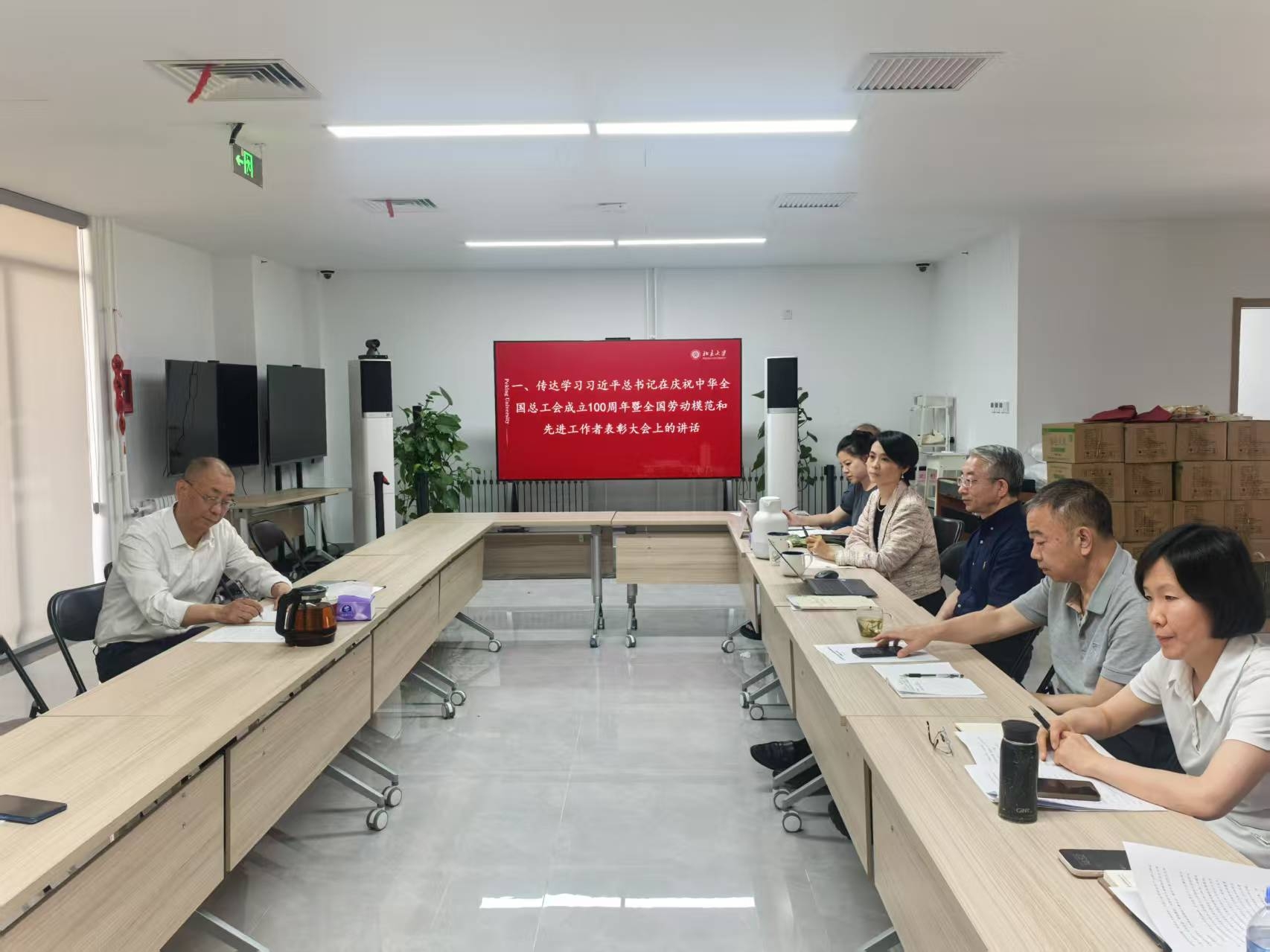 2025年6月4日下午,校工会传达学习习近平总书记在庆祝中华全国总工会成立100周年暨全国劳动模范和先进工作者表彰大会上的重要讲话精神。北京大学党委副书记姜国华,校务委员会副主任兼秘书长、校工会主席安钰峰,校工会常务副主席张宝岭,校工会副主席丁伟忠、张小萌、于晓凤及工会专职干部参加学习。