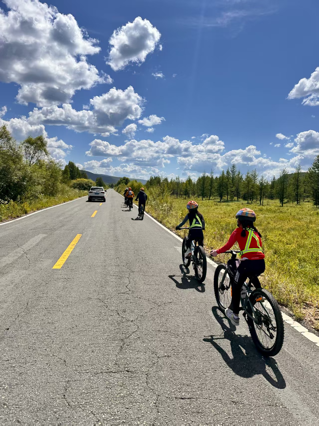 小朋友们无疑是最开心的!除了骑行,还参观国门区接受爱国主义教育,纵马草原感受天似穹庐笼盖四野,探访牧民人家与小动物亲密接触,搭乘森林小火车徜徉于群山怀抱,因道路受阻意外穿越次生原始森林感受密林探险…小伙伴们一路上互相鼓励互相追逐,与新朋友游戏,与老朋友叙旧,在不知不觉中创造了亲子组日骑行80公里的佳话。有3位9-10岁的小朋友们更是一路紧随领骑,日骑行达85公里。起伏路的上上下下更是给了小朋友们新的人生启示,付出辛苦,必有回报!