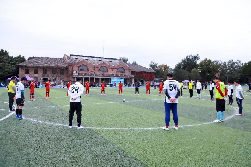 在静默的片刻中,微风掠过草场,红色队旗轻轻摇曳。所有人肃立凝神,神情庄重。那一刻,绿茵场不只是竞逐之地,更是精神的承载——一场纪念赛,因这份追思而更添厚重;“刚毅坚卓”的校训,在默哀的肃静中被再次铭记。