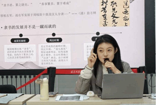 10月25日,由中国美术馆与北京大学联合培养博士后袁洋带来隶书专题教学。她首先梳理隶书作为“篆之捷”与“楷之源”的承前启后之历史定位,详解其“蚕头燕尾、波磔分明”的典型特征。针对《曹全碑》的洒脱俊逸与《乙瑛碑》的端庄古雅,袁洋采用对比教学法,从工具选择、点画练习到结构布局进行阶梯式指导。她特别强调了中锋运笔的稳定性,引导学员在临摹中感受汉代书法“刚柔相济”的美学特质,理解隶书对后世楷书的开创性影响。纵观十月三期课程,北京大学造型艺术协会巧妙地将“文字演变史”这一宏大主题内化为清晰的教学脉络,构建起一条从西周金文、秦代小篆到汉代隶书的完整学习链条。