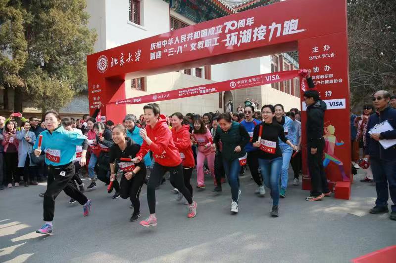 3月8日中午,由北京大学工会主办,体育教研部、教职工户外健身协会协办,中国农业银行支持的“庆祝中华人民共和国成立70周年暨迎三·八节女教职工环湖接力跑”活动在未名湖畔热烈举行,来自校本部各单位的191支队伍,1337名女教职工参加了活动。学校党委副书记、秘书长、工会主席安钰峰、中国农业银行北京分行副行长李爱华、校工会常务副主席张宝岭、体育教研部主任李宁、党总支书记张锐出席活动启动仪式并为接力跑鸣枪。活动由工会副主席刘杉杉主持。