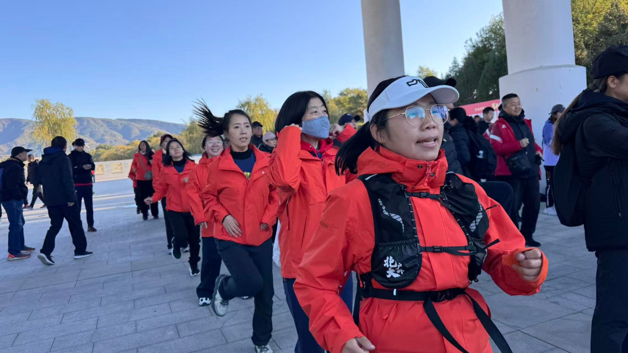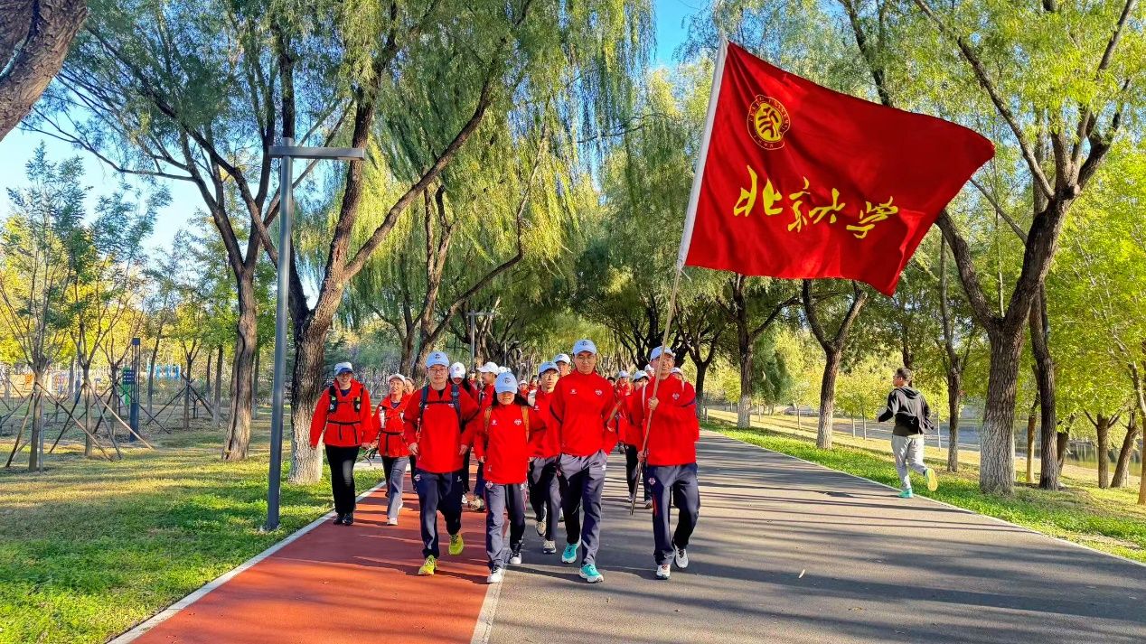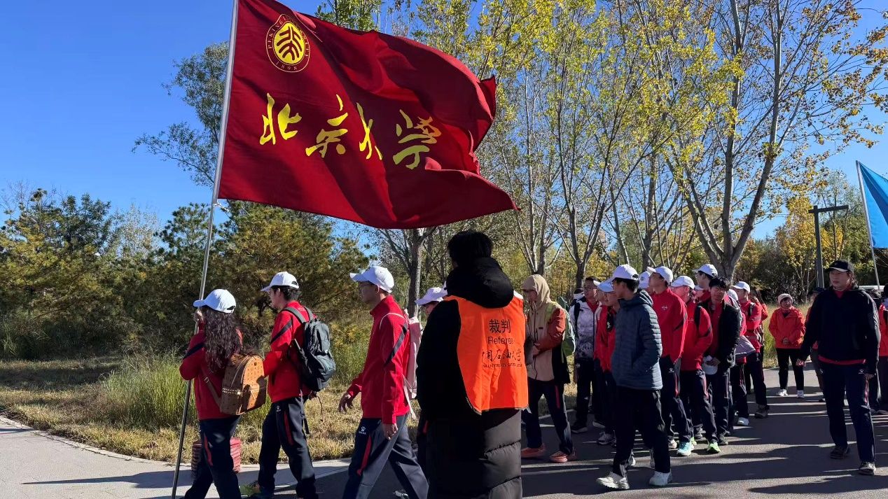 7点40分前,全体队员顺利完成检录。8点整,开幕式准时开始,北大师生方阵整齐划一,展现出良好的精神面貌。随着发令枪响,甲乙组分批次出发。北大师生代表队沿白浮泉公园步道有序前行,在徒步过程中严格遵守赛事规则,始终保持整齐的队形。