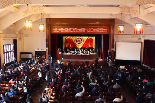 2013年1月17日,北京大学第六届教职工代表大会暨第十八次工会会员代表大会在办公楼礼堂隆重举行,258名正式代表参加会议。校党委书记朱善璐、校长周其凤等16位大会执行主席,在校校领导,中华全国总工会教科文卫体工会全国委员会副主席陈志标,北京市总工会副主席潘建新,北京市教育工会主席史利国等校外领导及兄弟院校嘉宾在主席台就坐。北大老领导、工会系统老同志、北京市教育工会常委、市教育工会第二片组成员单位代表,学校全国、北京市、海淀区和有关区县的人大代表和政协委员,各民主党派北京大学负责人、学校职能部门和院系负责人应邀出席会议。中国人民大学、北京师范大学、中国农业大学等兄弟院校向大会发来贺信。会议由校党委常务副书记、副校长张彦主持。