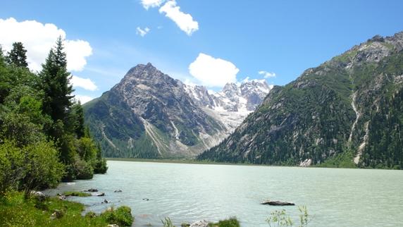 水乳交融的新路海和雀儿山(远端的雪峰)