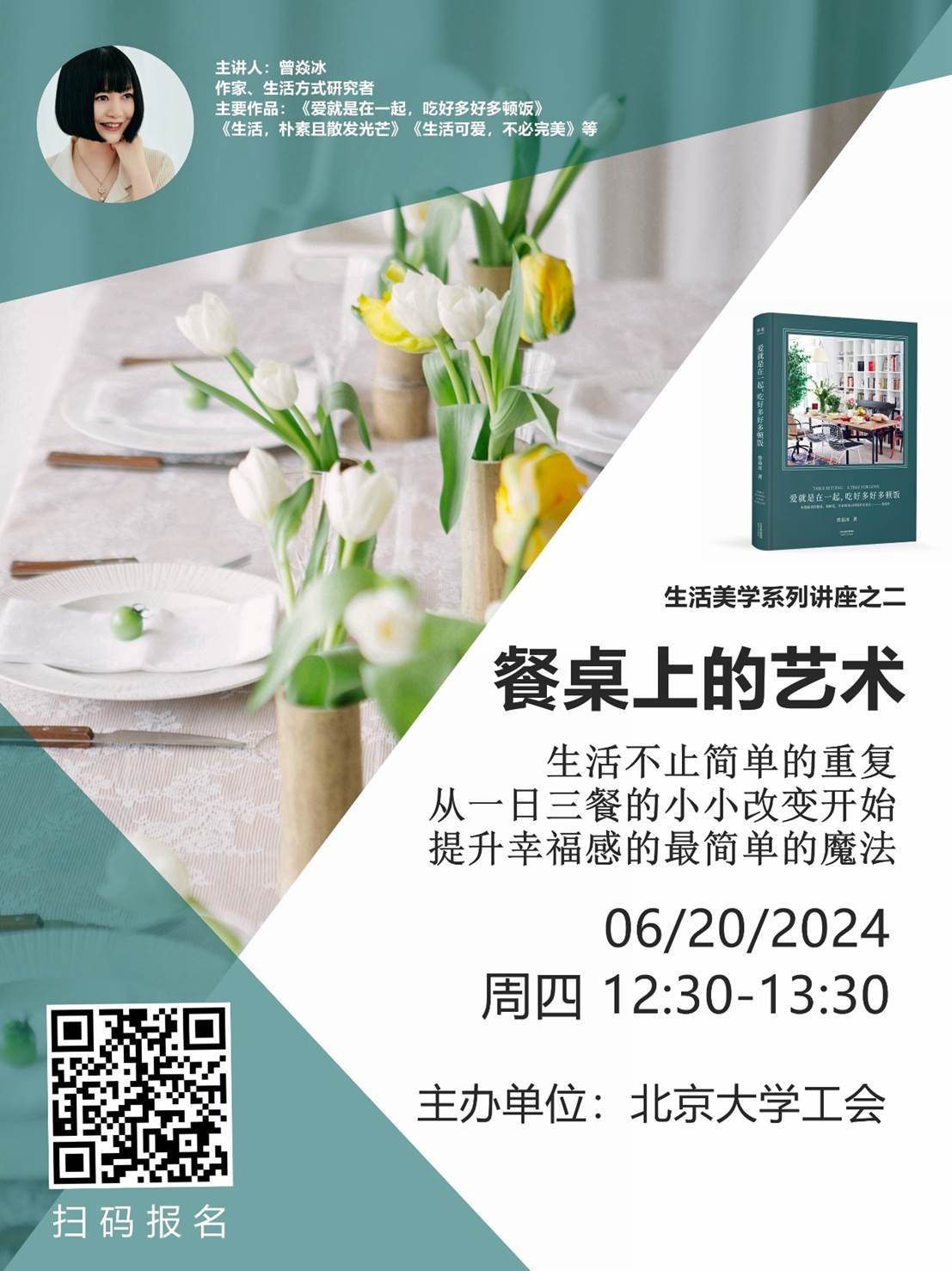 为丰富校园文化生活,引领广大教职工感受生活中的美,发现美、认识美、欣赏美,北京大学工会决定举办生活美学系列讲座,特邀作家、生活方式及餐桌艺术研究者、资深媒体人曾焱冰女士做系列分享。