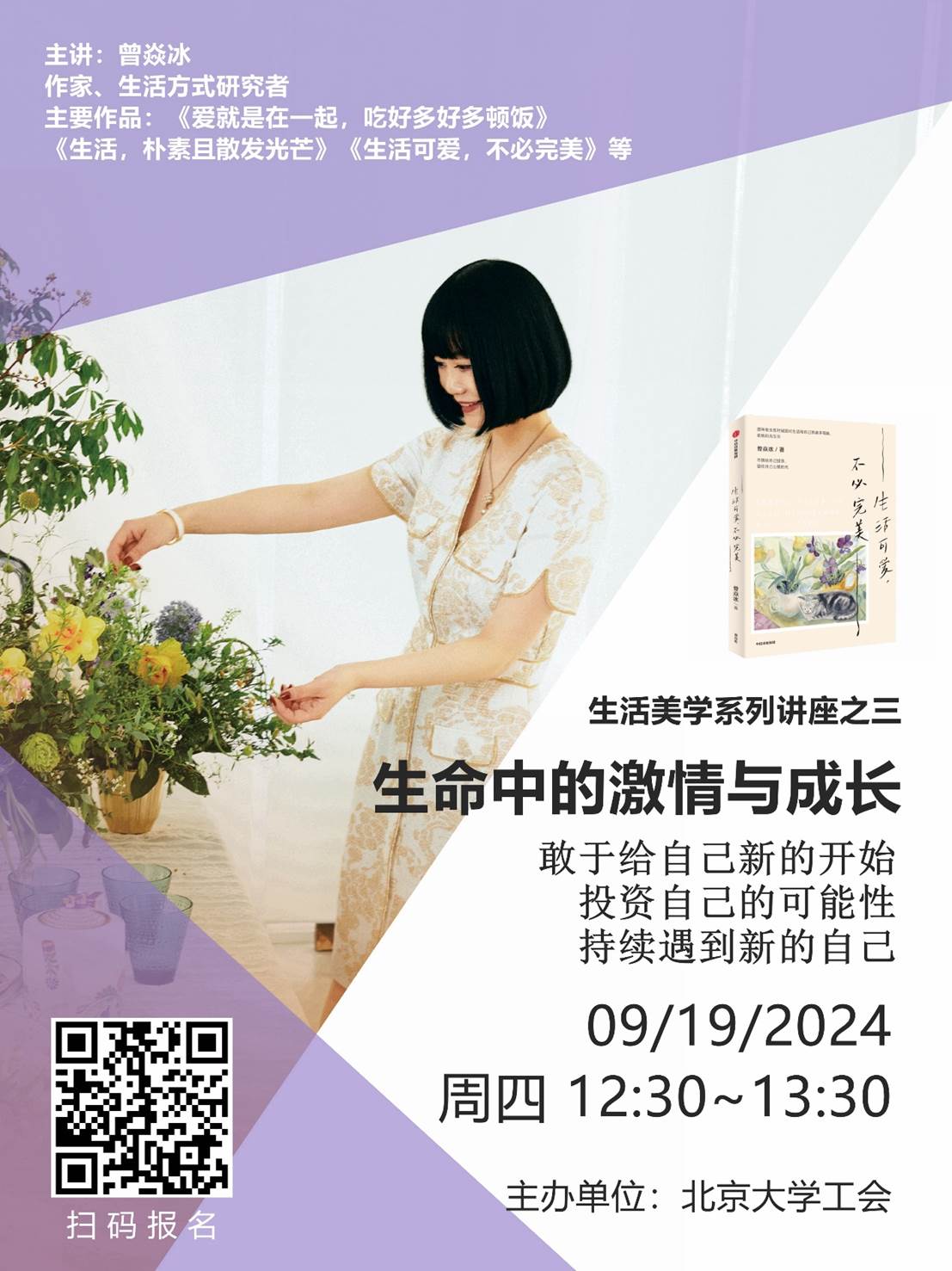 为丰富校园文化生活,引领广大教职工感受生活中的美,发现美、认识美、欣赏美,北京大学工会决定举办生活美学系列讲座,特邀作家、生活方式及餐桌艺术研究者、资深媒体人曾焱冰女士做系列分享。