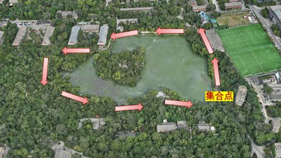 未名湖周边,集合地点和跑步路线如下图。