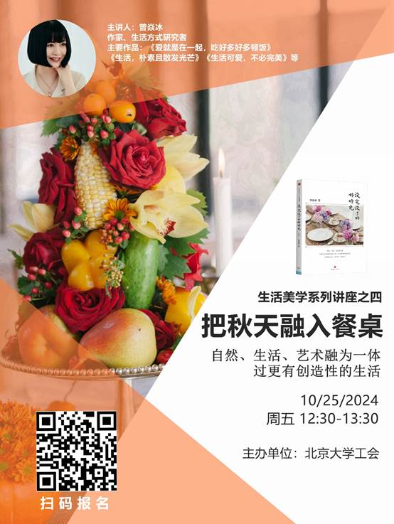 为丰富校园文化生活,引领广大教职工感受生活中的美,发现美、认识美、欣赏美,北京大学工会决定举办生活美学系列讲座,特邀作家、生活方式及餐桌艺术研究者、资深媒体人曾焱冰女士做系列分享。
