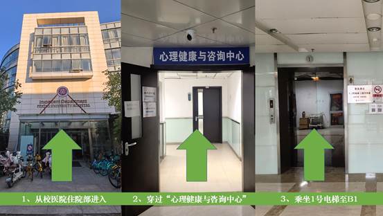 路线指引:出校医院便民门,从住院部门进入后,穿过心理咨询中心,乘坐1号电梯至B1层。