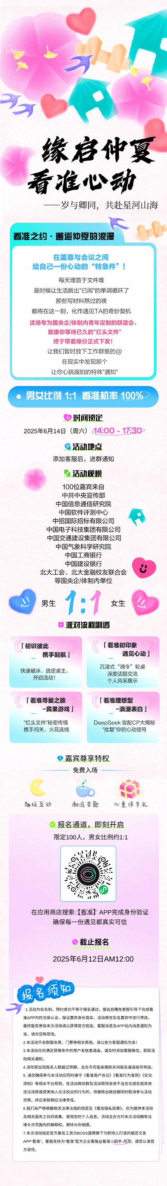 日前,接到邀约,拟请我校教职工参加“缘启仲夏,看准心动”百人单身联谊活动(公益)。本次活动由Boss直聘诚意出品的相亲APP【看准】主办,定向邀约单位包括中宣部、中国电科、中交、工行、建行、信通院、中招国际、中国软件评测中心、气象局、北大等优质国央企/体制内单位,活动纯公益免费,带你走进一场高质量的社交派对,精心设计的CP游戏、精致的心意伴手礼与茶歇,助力你与爱的美妙邂逅。活动具体事宜如下: