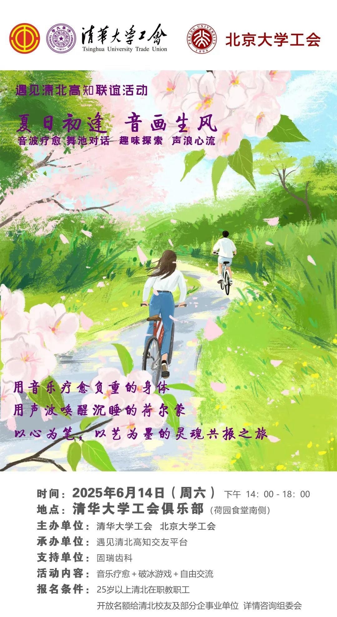 为促进与兄弟单位间的交流,给青年教职工搭建交友平台,6月14日(周六),清华大学工会联合北京大学工会在清华大学工会俱乐部举办 “「夏日初逢·音画生风」——青年教职工联谊活动”,期待在清华荷塘月色,遇见对的你!
