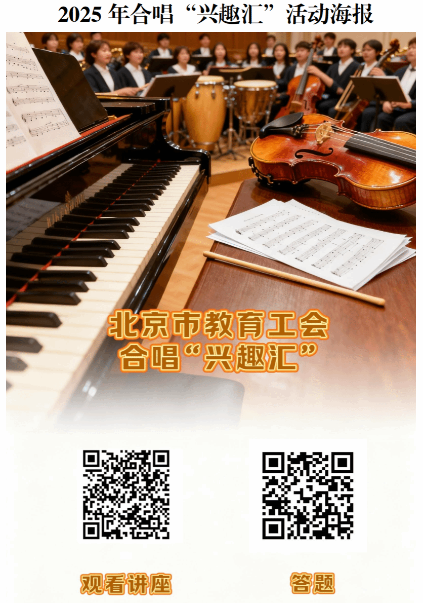 为深入学习贯彻党的二十届四中全会精神,深度挖掘美好生活的精神文化内涵,丰富广大教职工业余文化生活,营造和谐文化氛围,进一步推动首都教育系统美好生活系列活动的高质量发展,北京市教育工会继续举办2025年合唱“兴趣汇”活动,由朝阳区教育工会具体承办。现将有关事项通知如下。