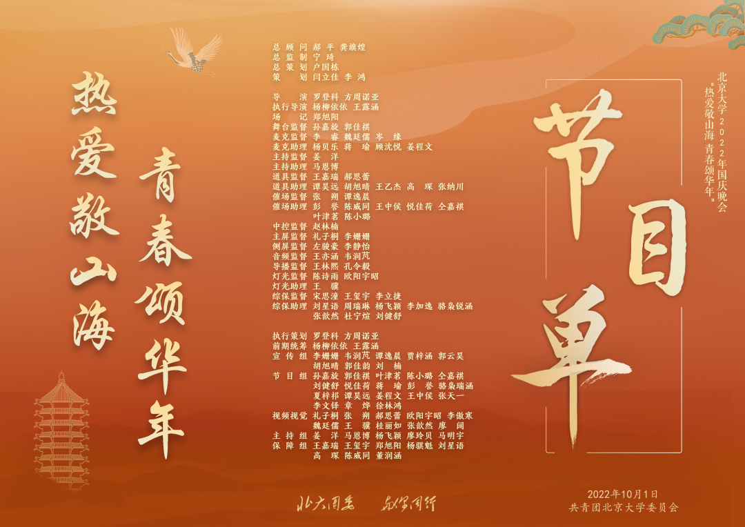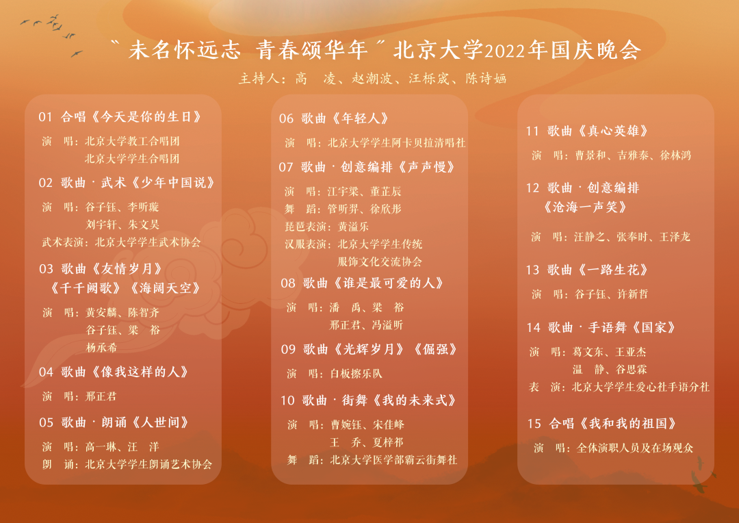 2022年10月1日是中华人民共和国成立73周年,也是我们中国共产党二十大即将胜利召开之际,在这举国欢庆的大好日子里,北京大学2022年国庆晚会——“未名怀远志 青春颂年华”在美丽的燕园静园草坪如约举行。