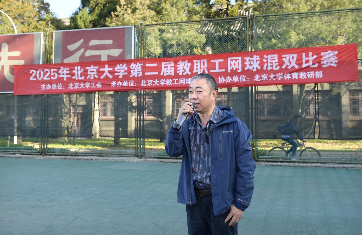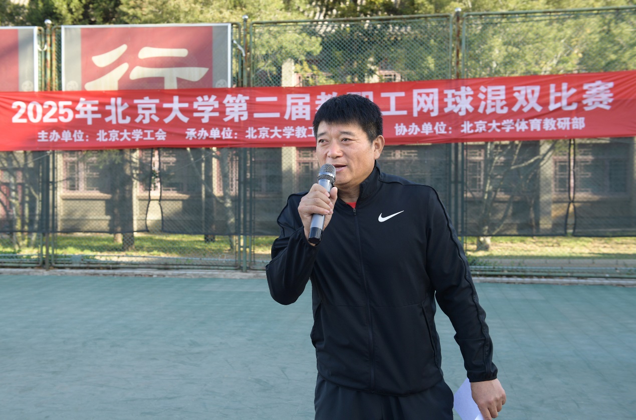 北京大学工会常务副主席张宝岭致辞,表示工会将继续大力支持网球协会的活动,并预祝比赛圆满成功。裁判长王艺靖介绍赛制规则。北京大学教工网球协会会长、体育教研部副主任刘茂辉主持开幕式。