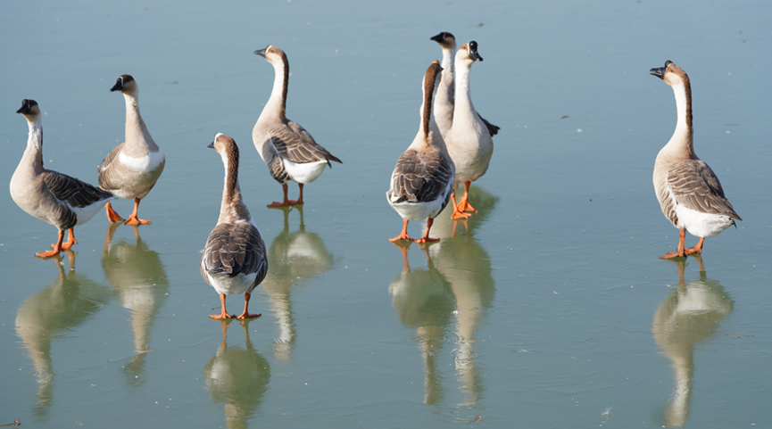 由于正值候鸟南飞的季节,本次活动的重中之重自然是到黄河三角洲湿地自然保护区与众多鸟类“亲密接触“。黄河三角洲湿地国家级自然保护区,是以保护黄河口新生湿地生态系统和珍稀濒危鸟类为主体的湿地类型自然保护区,全球9条鸟类迁徙路线中,东亚-澳大利西亚和环西太平洋2条线路均经过黄河三角洲。随着由石油城向旅游城市的转型,东营市越来越重视本地生态系统的重建和维护,因此随着自然生态的逐步恢复和提升,现在湿地自然保护区的鸟类已由1992年的187种、增加到2000年的283种、直至现在的373种,其中国家一级、二级保护鸟类分别有26种、65种,国家级珍稀鸟类达91种,38种鸟类数量超过全球总量的1%。每年这里南来北往的鸟类六百多万只,被国内外鸟类专家称为“鸟类天堂”和“鸟类国际机场”,是鸟类迁徙的重要中转站。本次活动的队伍中不乏观鸟爱好者,更有两位来自城环学院的专家,借助城环学院的郑成洋老师的镜头帮助大家一共识别出17种大型鸟类。当一行人徒步在芦苇荡中,看到鸟儿或悠哉游哉地游在蓝蓝的湖面上,或咕咕嘎嘎叽叽喳喳在芦苇丛中欢唱,或振翅在蔚蓝的天空中翱翔,和鸟儿的亲密接触让大家惊喜不断,脚步格外轻快,心情格外舒畅,感觉自己也长上了翅膀要飞了起来。