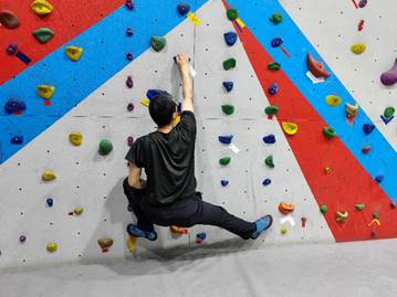 课程进入自由挂壁训练环节。规则很简单,老师们可以采用任何姿势,只要能在岩壁上坚持即可。老师们纷纷挑战自我:有人以"蜘蛛侠"式贴壁静默坚持,有人尝试攀爬来回寻找舒服的姿势,还有的创新出"太空步"趣味姿势。尽管汗水浸透衣衫,但笑声回荡在整个岩壁场馆。令人惊喜的是,大部分老师都展现出了顽强的毅力,成功坚持了3分钟。