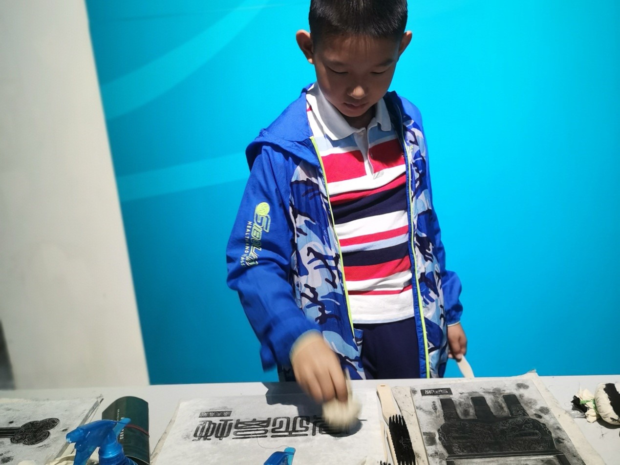 结束了参观,我们开始了期待已久的拓片制作。每个小朋友先选好一个刻有自己喜欢的图案的石板,上面铺一张宣纸,用小喷壶把纸喷潮,拿起刷子拍打,在拓片上留出印来,用拓包沾上墨往宣纸上一点点按压,直到打满整个图案,再用吹风机吹干,最后盖上纪念章、塑封好,一个完整的有纪念意义的拓片作品就完成了。对我而言,这个过程真是无比简单、毫无挑战。