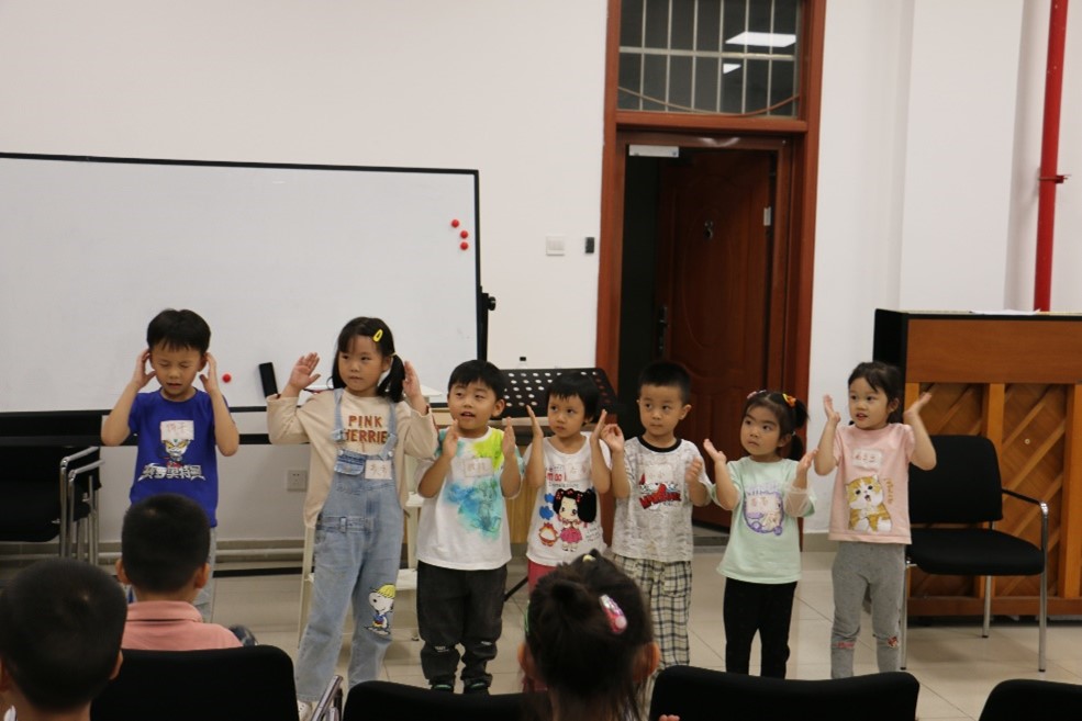 正式进入练习时间,楠楠老师开始教大家打拍子。跟着《小星星》这首歌,老师示范在每个乐句的开头和结尾打拍子,每句歌词结束时动作有变化,捂嘴巴、捂耳朵、捂眼睛,孩子们认真听曲子,跟着老师做动作,还争相到台上表演,非常可爱。