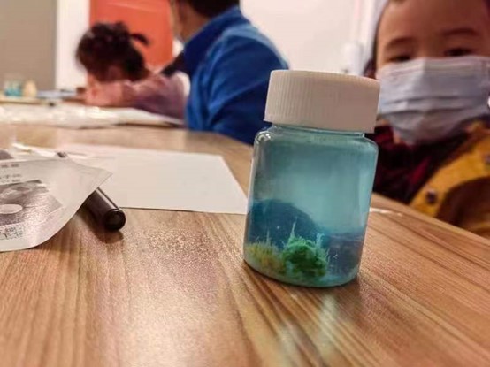 可能是我在课上晃动了瓶子,我的珊瑚没种出来,好遗憾。不过,旁边的小朋友成功地种出了珊瑚,大家都好奇地趴过去看。